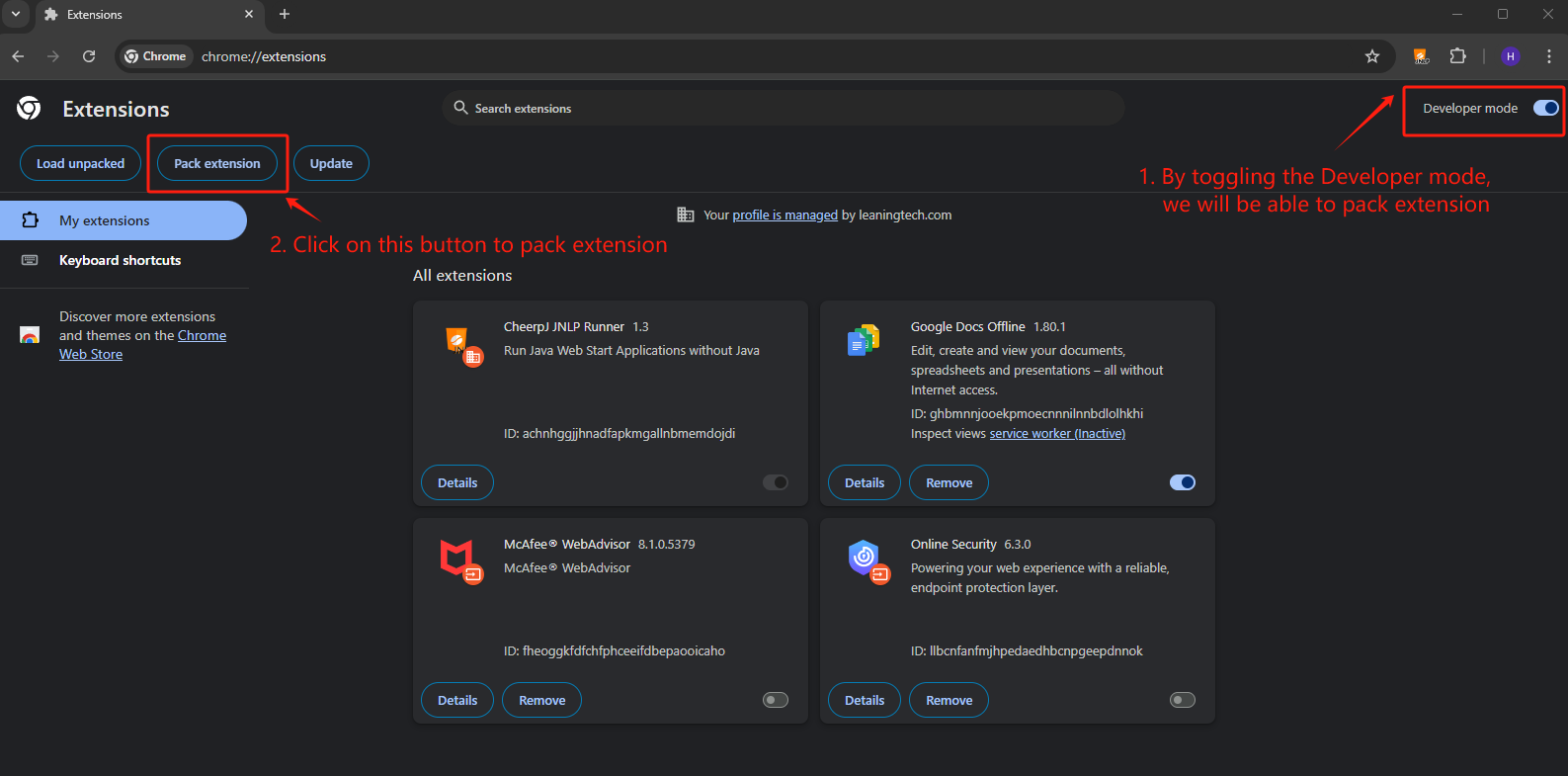 Let us now toggle the Developer mode switch to enable it at the top-right of the Extensions page. This allows you to pack extensions.