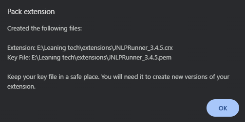 Click Pack extension - Chrome will create two files in the parent directory of your extension: - A .crx file (the packed extension) - A .pem file (the private key, if you didn’t provide one)